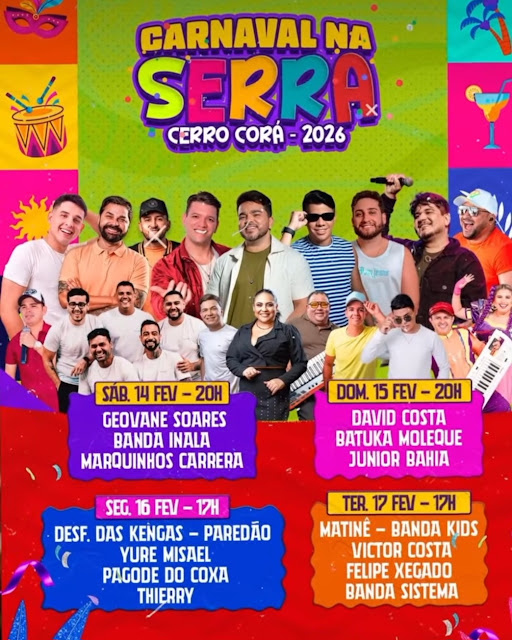 A programação do Carnaval na Serra 2026 foca muito em artistas regionais e talentos do Rio Grande do Norte, trazendo aquele mix clássico de axé, pagode, forró e ritmos carnavalescos. Os shows começam às 20 horas, no sábado e domingo e às 17 horas na segunda e terça-feiras, no palco montado na praça Tomaz Pereira de Araújo.