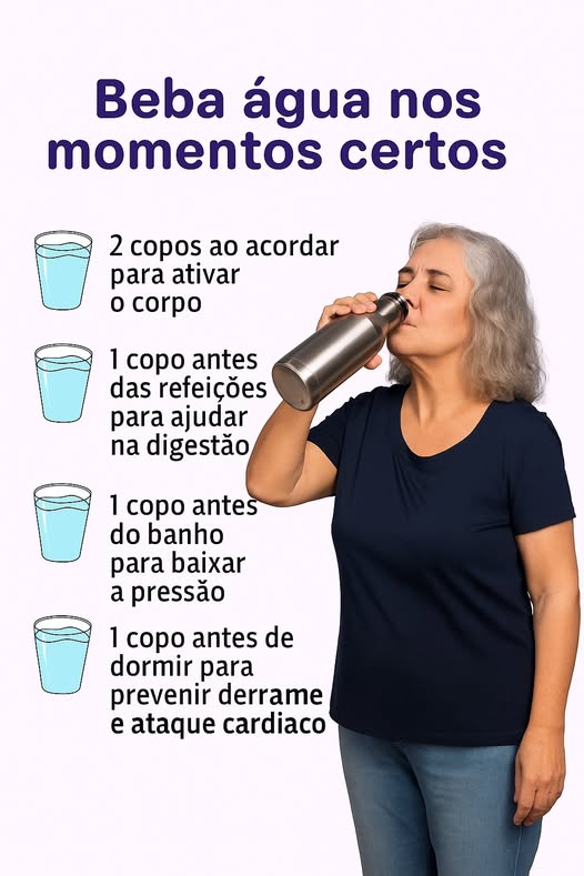 Beber um copo antes do banho ajuda a estabilizar a pressão, principalmente em pessoas sensíveis a variações de temperatura. E antes de dormir, um copo de água mantém a fluidez do sangue, reduzindo o risco de eventos cardiovasculares noturnos.