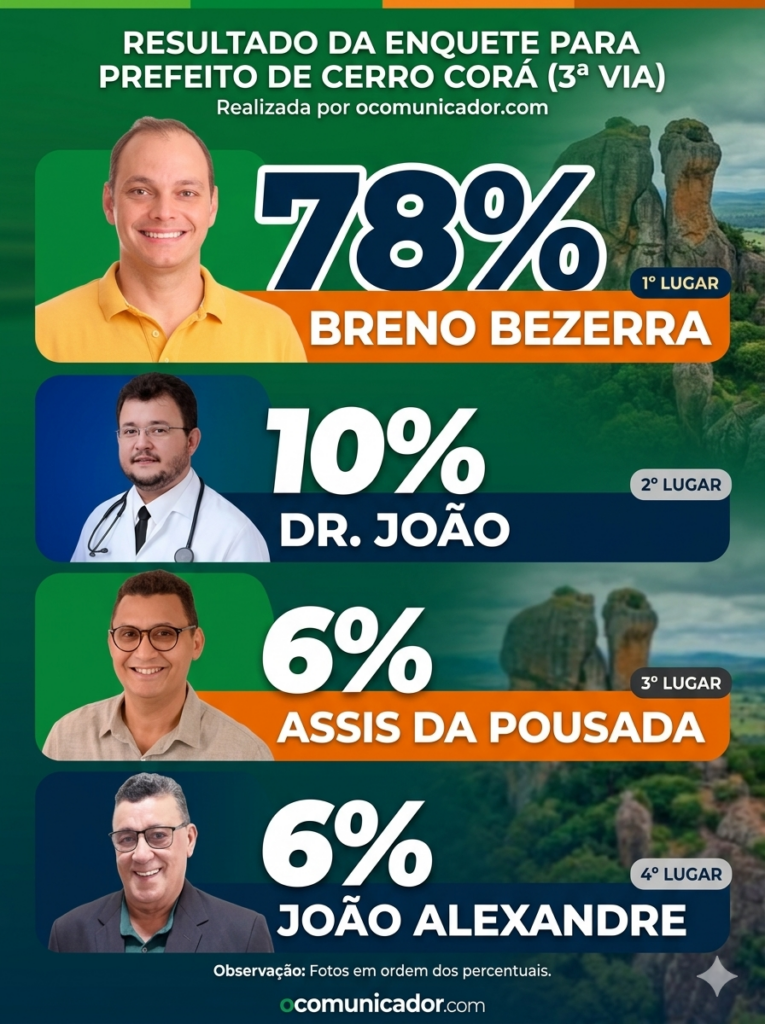 CERRO CORÁ – O cenário político para a sucessão municipal de 2028 começou a ganhar novos contornos após uma consulta popular realizada pelo perfil ocomunicador.com no Instagram. Em uma simulação focada em uma eventual “terceira via”, o atual vereador Breno Bezerra obteve uma vitória esmagadora, atingindo 78% da preferência dos internautas que participaram da votação.