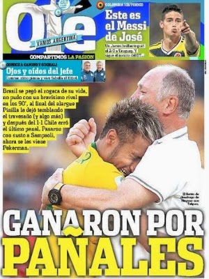 O Chile errou o último pênalti. Passaram por Sampaoli com um susto, agora enfrentam o time de Pekerman”, diz o jornal, citando a Colômbia, adversária das quartas de final.