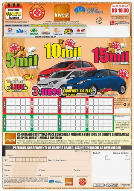 | Natal Cap sorteia 3 Carros HB20 de uma só vez no próximo domingo Compre seu titulo de Capitalização por apenas R$ 10,00 Reais. Pontos de Vendas. Luiz de Eudócia e Kitanda Medeiros |