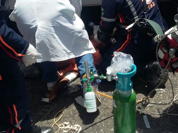 A moça teve um ferimento na perna após a moto colidir em ônibus.