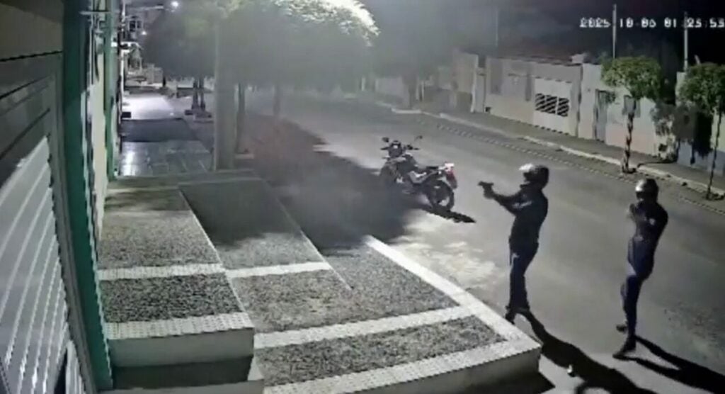 O momento em que os suspeitos desceram do veículo foi registrado por câmeras de segurança. Um deles chegou a chutar o portão do imóvel. Na sequência, ambos efetuaram mais de 15 disparos de arma de fogo contra a residência e a clínica, que ficam lado a lado no centro da cidade.