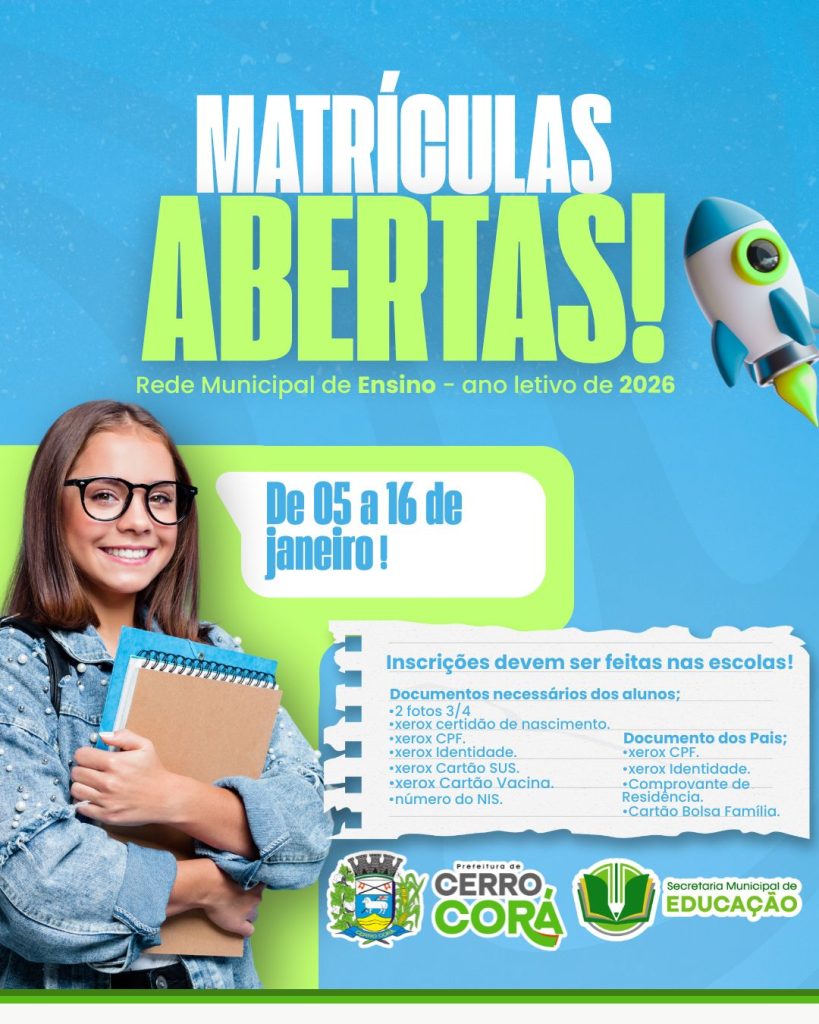 Está aberto o período de matrículas e rematrículas para o ano letivo 2026! De 05 a 16 de janeiro, das 7h às 12h da manhã, pais ou responsáveis de crianças com idade para ingressar na jornada escolar podem procurar as próprias instituições de ensino localizadas na zona urbana para a realização dos registros. Já para matriculas/rematrículas nas escolas localizadas na zona rural, deve-se procurar o Centro de Ensino Rural Julita Constância de Assis para a efetivação das mesmas, no mesmo período e horário.