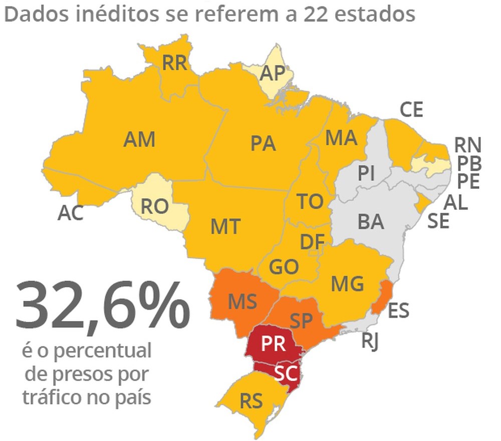 No Paraná, o percentual de presos por tráfico passou de 16,8% em 2013 para 59,3% neste ano. O estado possui o maior percentual do Brasil.