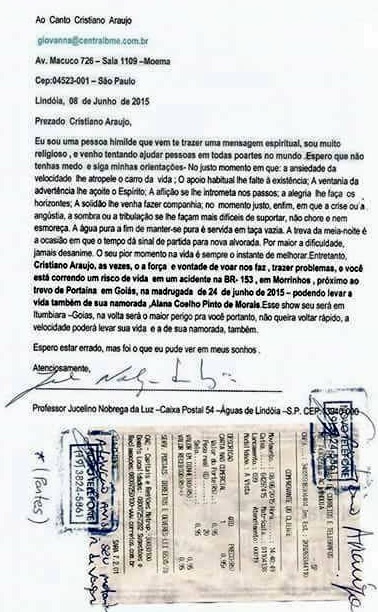 Na carta, o vidente afirma que o acidente seria na BR-153, em Morrinhos, próximo ao trevo de PontaIina, em Goiás. “Esse show seu será em Itumbiara- Goiás, na volta será o maior perigo pra você portanto, não queira voltar rápido, a velocidade poderá levar sua vida e de sua namorada, também”, escreveu Jucelino.