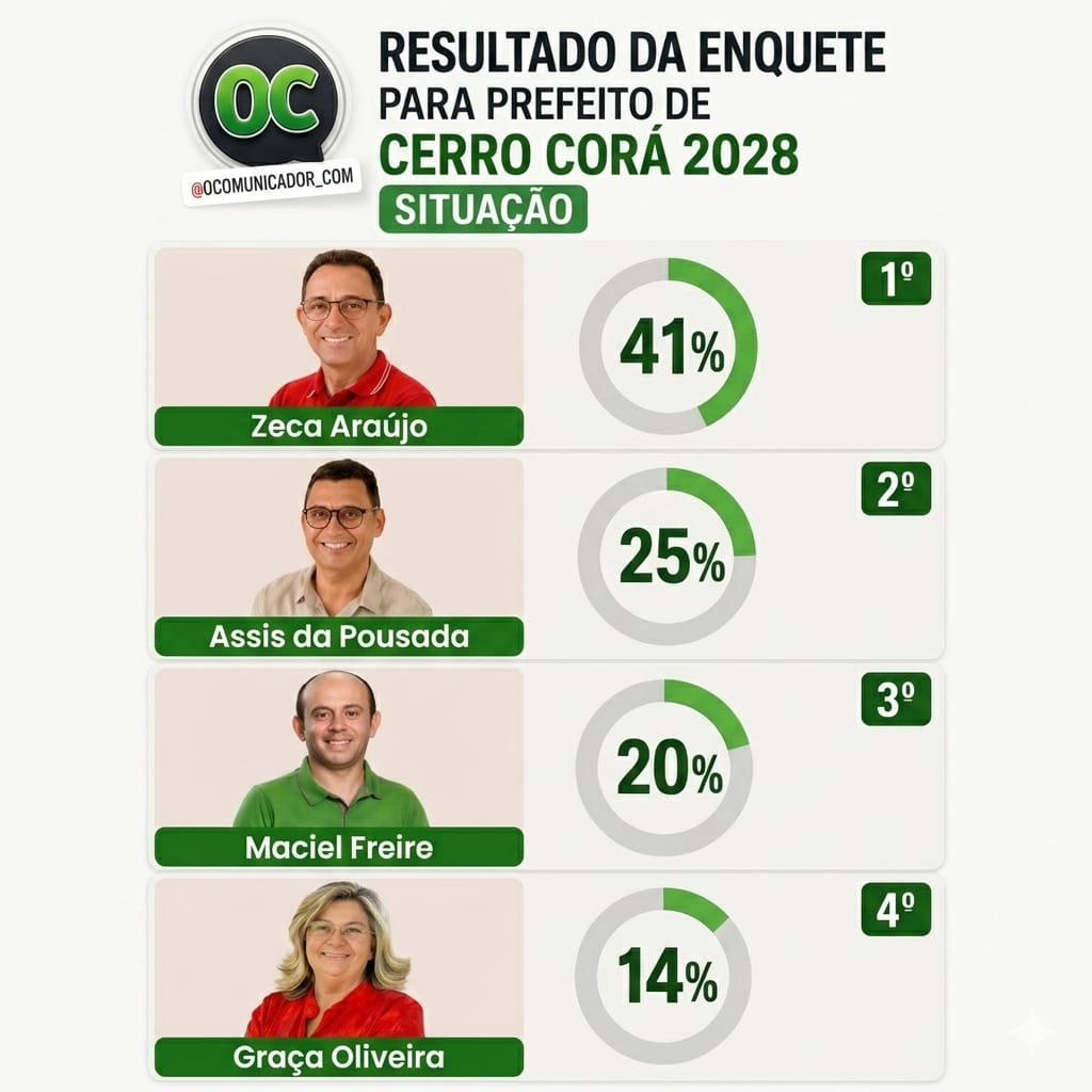 CERRO CORÁ – O portal ocomunicador.com divulgou o resultado de sua 3ª enquete de opinião, que buscou medir o termômetro político para o pleito municipal de 2028. Em uma simulação envolvendo nomes do atual sistema de situação, o cenário revelou surpresas que podem redesenhar as estratégias políticas locais.